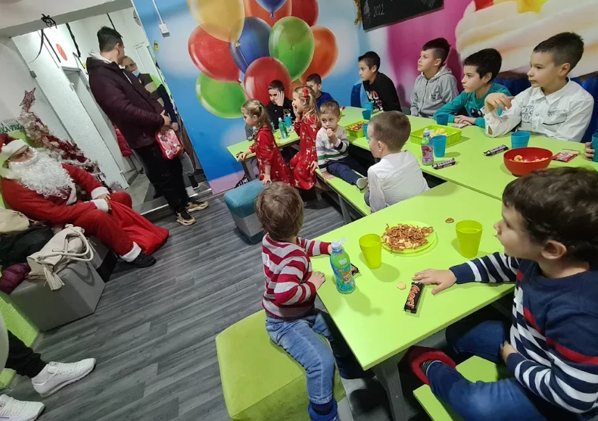 Trka Frka u Novom Sadu je zatvoren prostor namenjen proslavama rođendana, sa jasno izraženim sportskim karakterom i sadržajima koji su prilagođeni deci uzrasta od 4 do 13 godina. Na fotografijama se vidi dinamično uređen enterijer sa velikom otvorenom zonom za kretanje i igru, trampolinom, veštačkom sten om za penjanje i sportskim poligonom sa strunjačama, obručima i rekvizitima za aktivne igre. Prostor je vizuelno upečatljiv, sa šarenim detaljima, tematski oslikanim zidovima i posebnim delovima za okupljanje dece tokom proslave. Pored zone za igru, vidi se i deo sa stolovima i sedenjem, kao i prostor uređen za posluženje i druženje gostiju. Trka Frka deluje kao mesto koje spaja kretanje, zabavu i rođendansku atmosferu, pa može biti dobar izbor za roditelje koji traže igraonicu sa aktivnijim sadržajem i prostorom za grupne proslave.